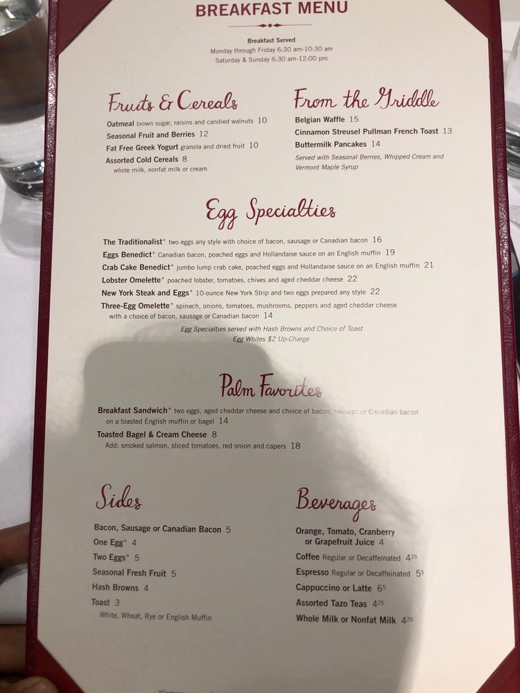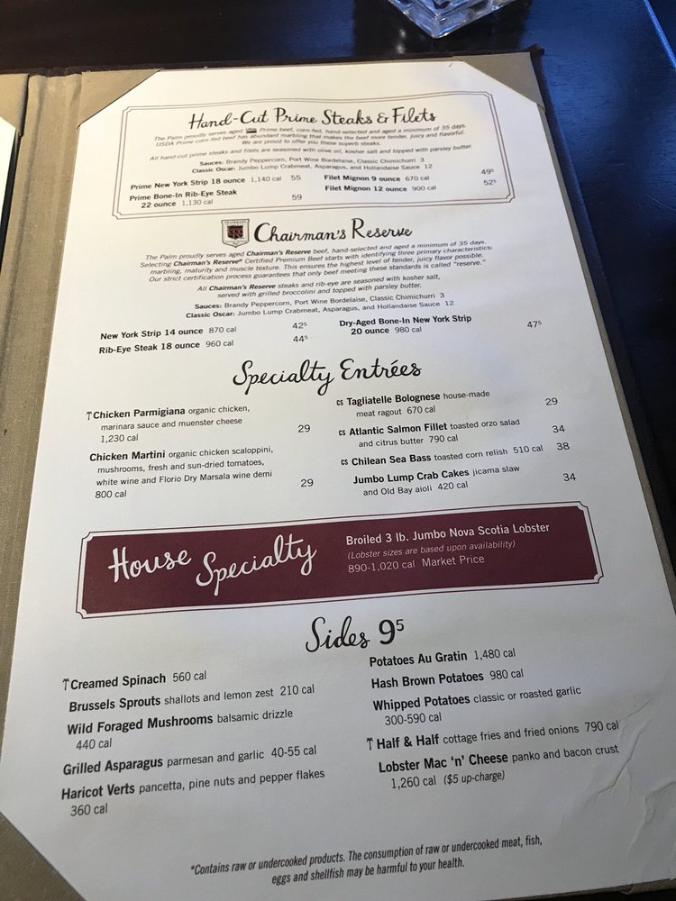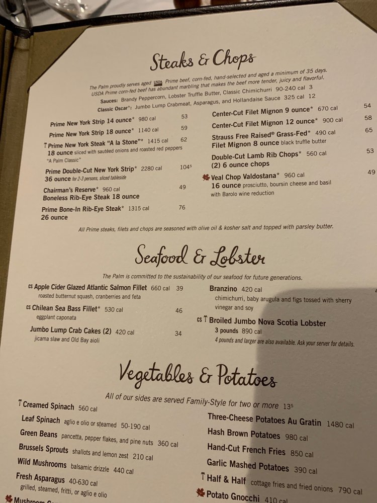 The Palm proudly serves aged USDA Prime beef, corn-fed, hand selected and aged a minimum of days.
